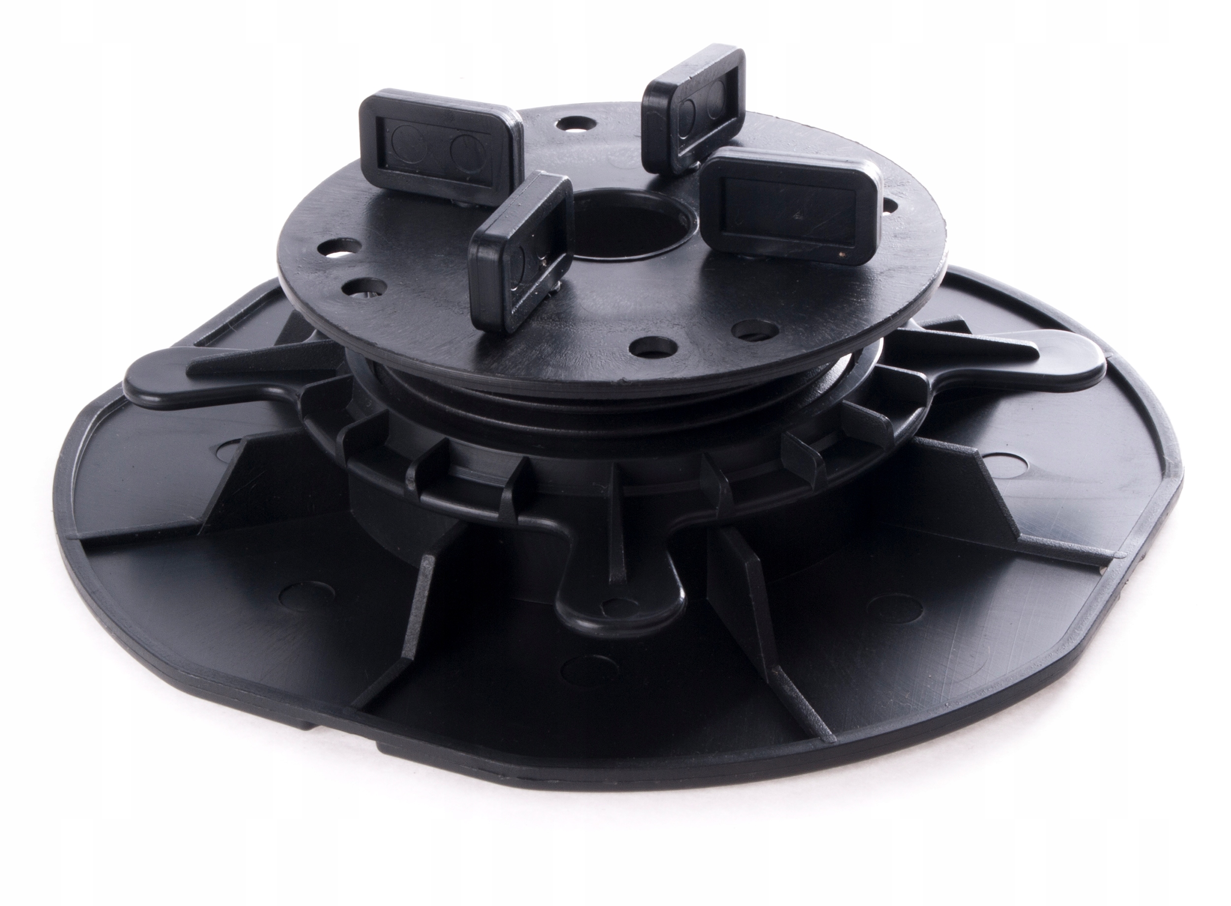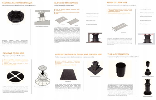 System podkładek poziomujących układanych w żeberkach „główki” wspornika zwiększa stabilność, dodatkowo zapewnia wyciszenie systemu.