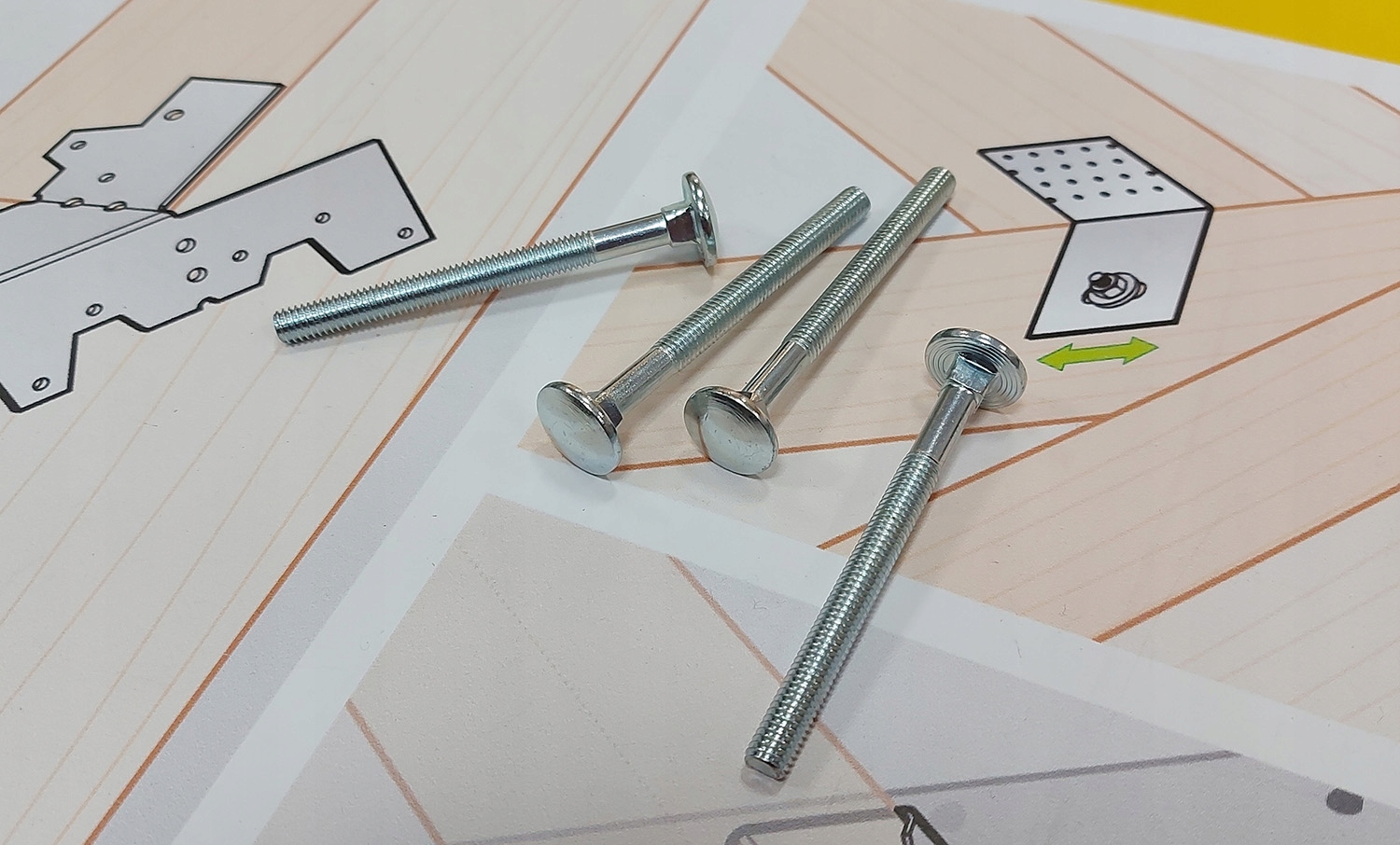 - Łeb grzybkowy z podsadzeniem kwadratowym - bezpieczne i estetyczne wykonanie połączenia, Podsadzenie zapobiega obrotowi śruby podczas montażu