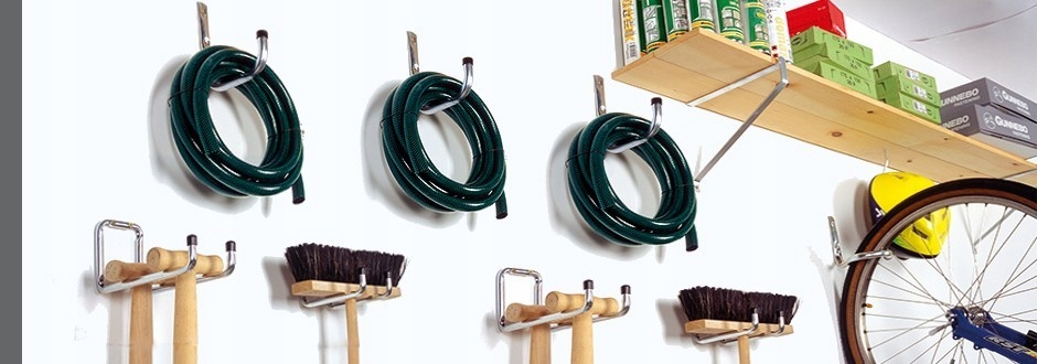 Podwójne haki garażowe, które świetnie sprawdzają się do przechowywania narzędzi z szerokimi rączkami -wideł, łopat czy szpadli. Zagięcie na zakończeniu zabezpiecza przed zsunięciem się zawieszonych przedmiotów.