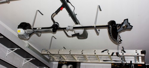 Podwójne haki garażowe umożliwiające zawieszenie większych narzędzi, zawinięcie kabla czy liny.