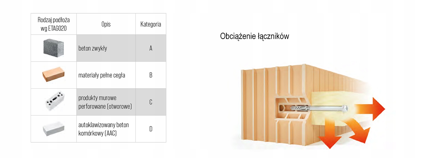 Może zostać zastosowany do: A - beton zwykły, B - cegła pełna ceramiczna / silikatowa, C - cegły perforowane (otworowe), D - beton komórkowy (AAC) / elementy na kruszywie lekkim (LAC)