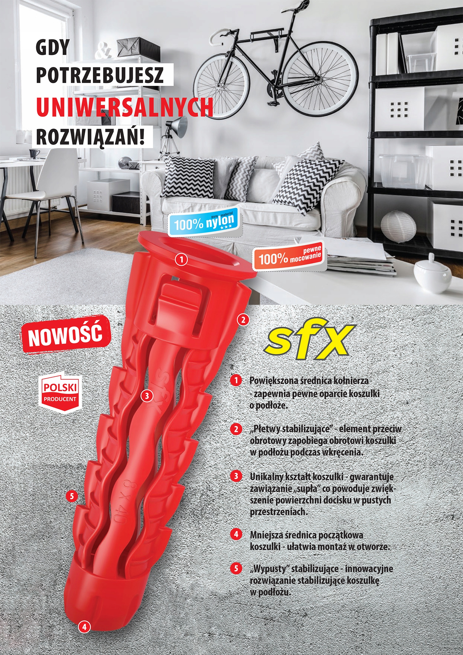 Wewnętrzna budowa SFX eliminuje problem nieosiowego wkręcania wkręta w koszulkę kierując go osiowo w otwór ściągająco-przelotowy. Powiększona średnica kołnierza zapobiega zbyt głębokiemu osadzeniu kołka w podłożu, a zmniejszona średnica na początku koszulki – ułatwia jej montaż w otworze.