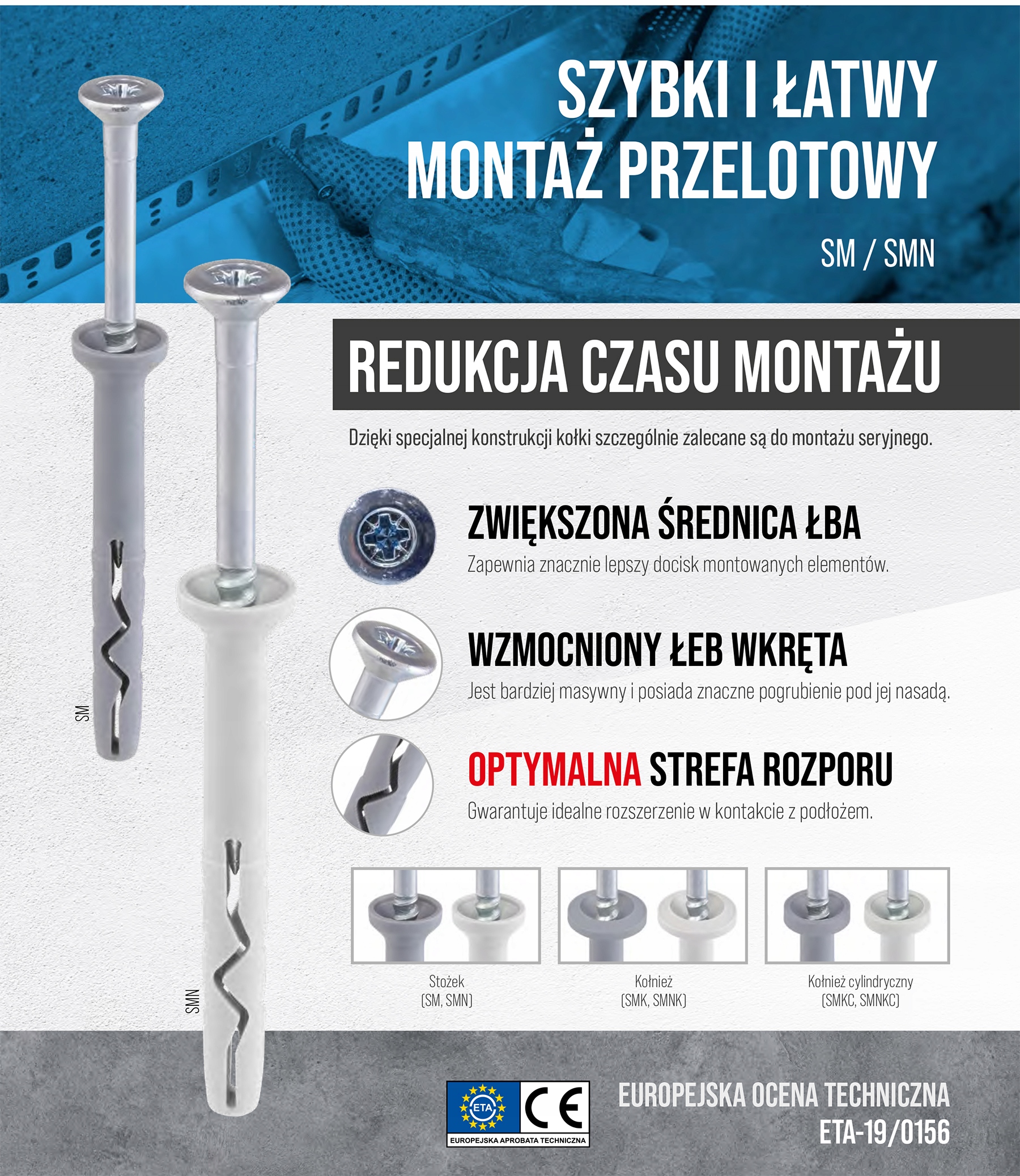 Kołek szybkiego montażu SM/SMN składa się z koszulki wykonanej z polipropylenu lub poliamidu oraz z wkręta z łbem stożkowym wykonanego ze stali ocynkowanej. Przeznaczony jest do montażu elementów drewnianych i drewnopochodnych. Zwiększona średnica głowy zapewnia lepszy docisk mocowanych elementów, a pogrubienie pod jej nasadą gwarantuje pewny montaż i niweluje uszkodzenie wkręta podczas wbijania.