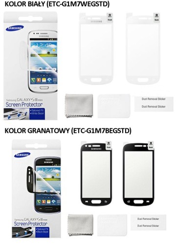 Folia ochronna na ekran do Samsung Galaxy S3mini kod producenta ETC-G1M7BEGSTD (kolor granatowy) oraz ETC-G1M7WEGSTD (kolor biały). W opakowaniu 2 sztuki. Pasują do modeli Galaxy S3 mini GT-i8190 oraz GT-i8190N Folie idealnie przylegają do całego przodu.