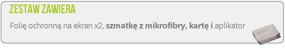 - Dzięki dołączonej do zestawu ściereczce z mikrofibry skończą się również twoje kłopoty z wiecznie „zapalcowanym” wyświetlaczem. Usunie ona te nieprzyjemne znamiona użytkowania za pomocą jednego ruchu ręką. I co ważne...podczas czyszczenia już nie poczujesz strachu przed jego zarysowaniem.