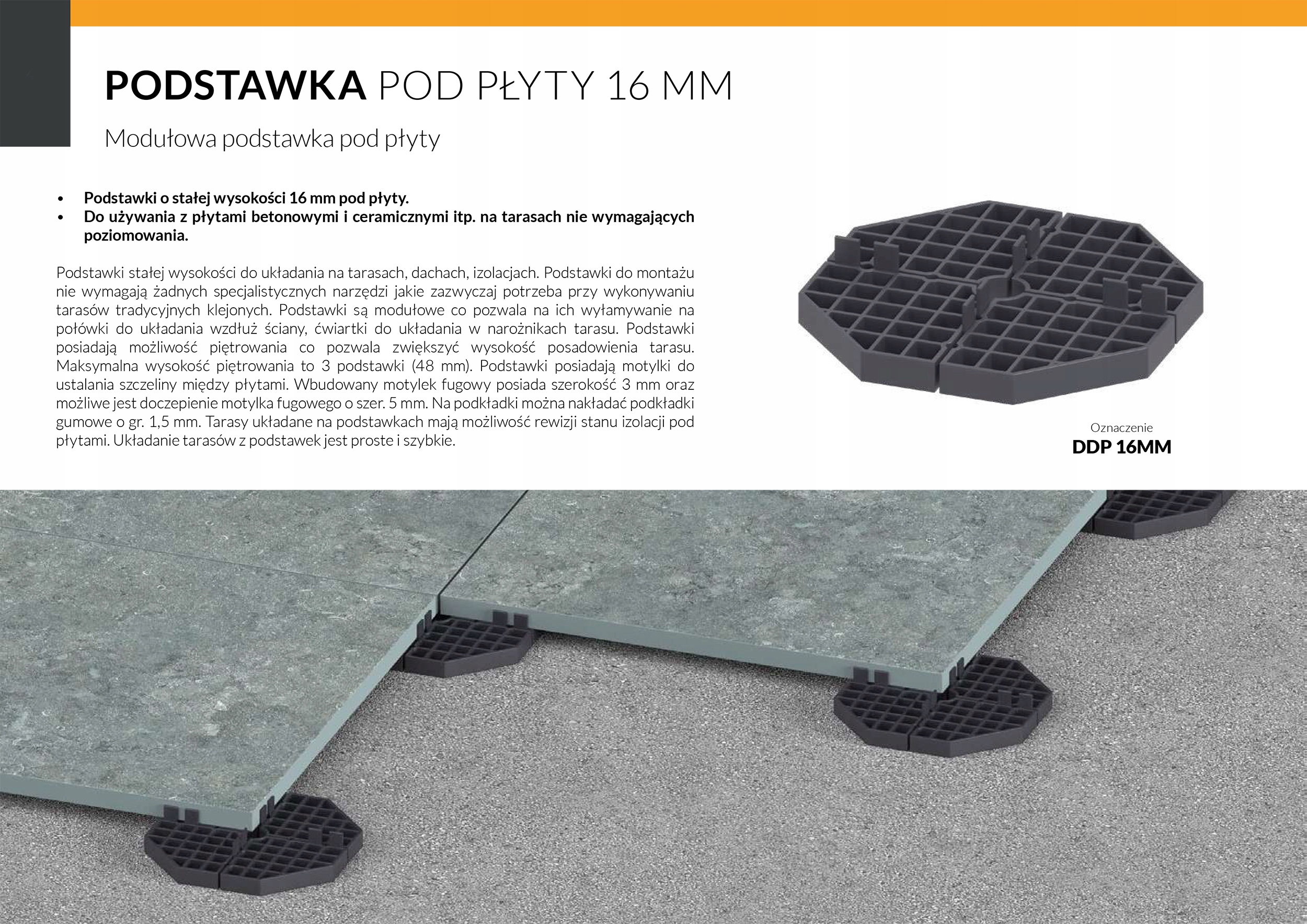 - Wsporniki można układać na betonie bez izolacji, na asfalcie, na pokryciu hydroizolacyjnym lub innych podłożach o podobnej stabilności.