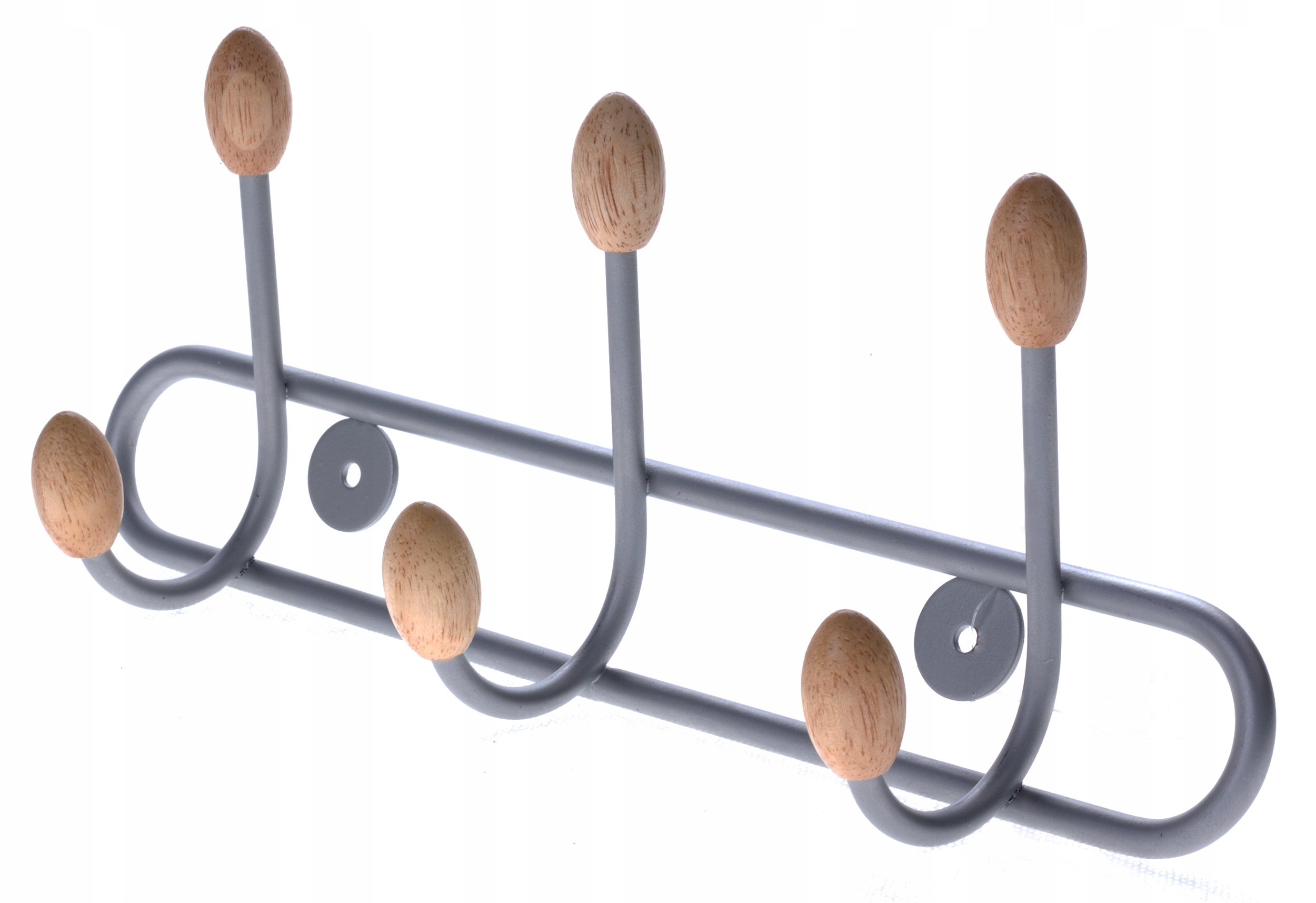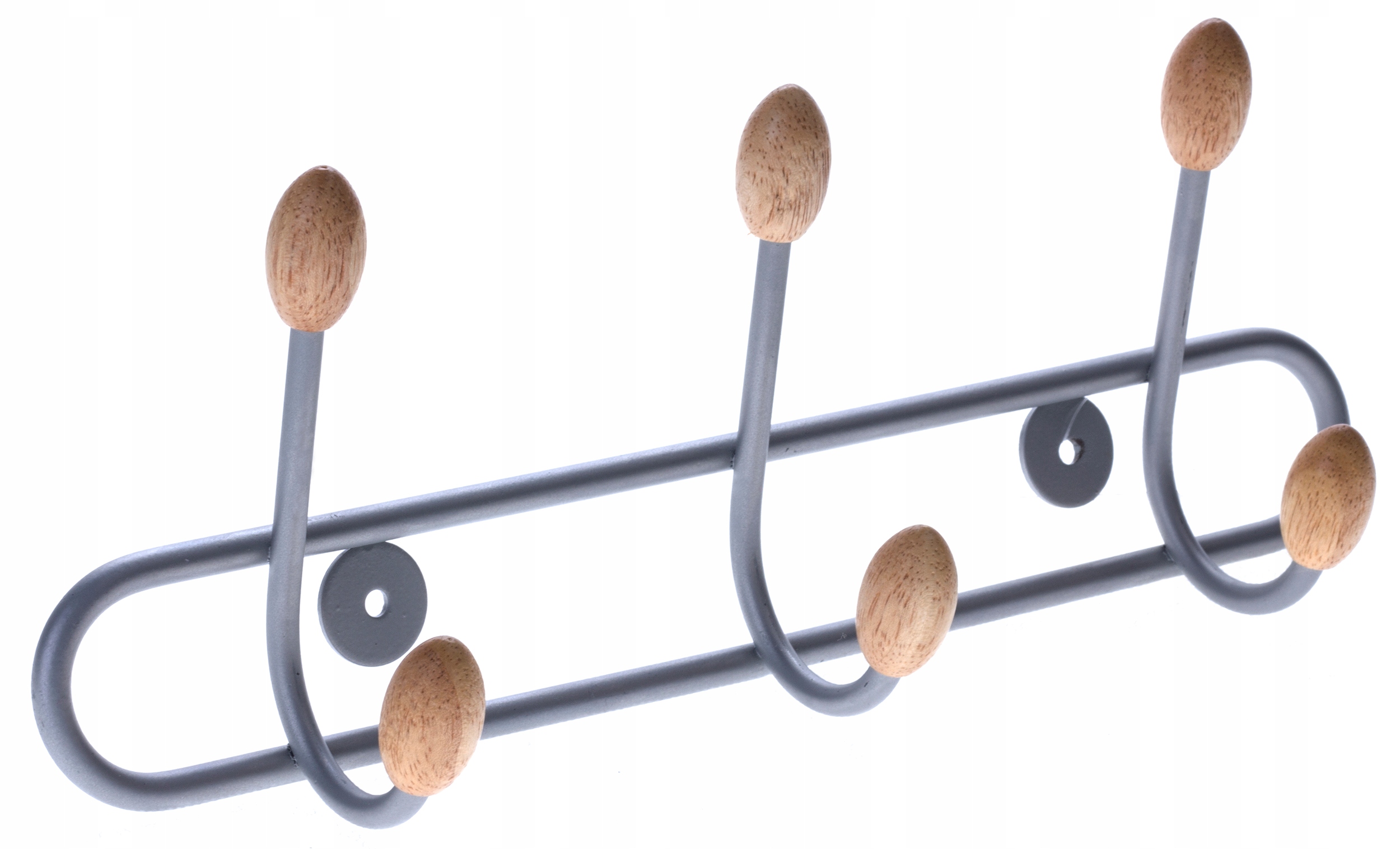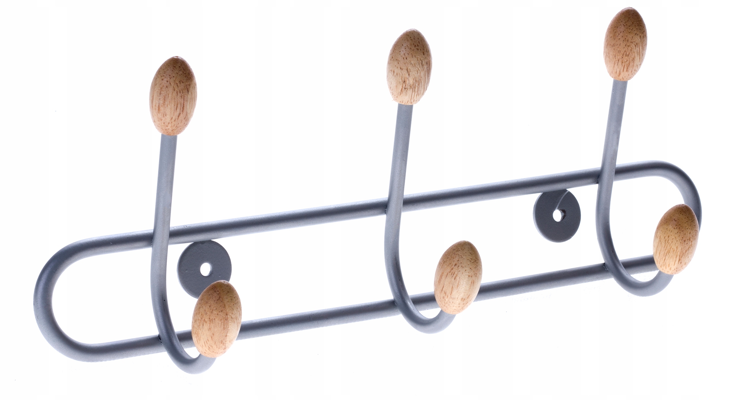Metalowe wieszaki zakończone elementem z jasnego drewna dopełnią wystrój poczekalni, biura czy przedpokoju w domu.