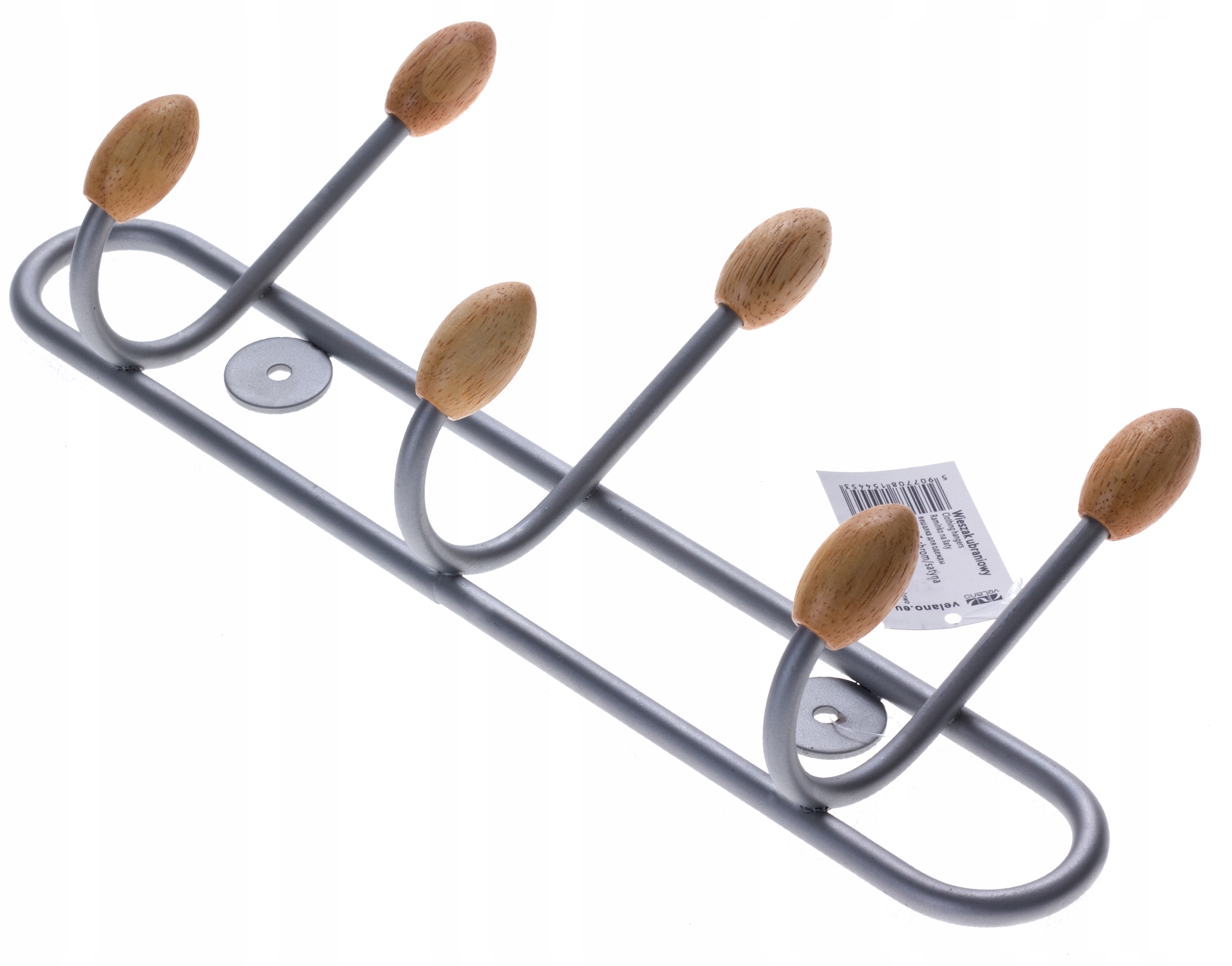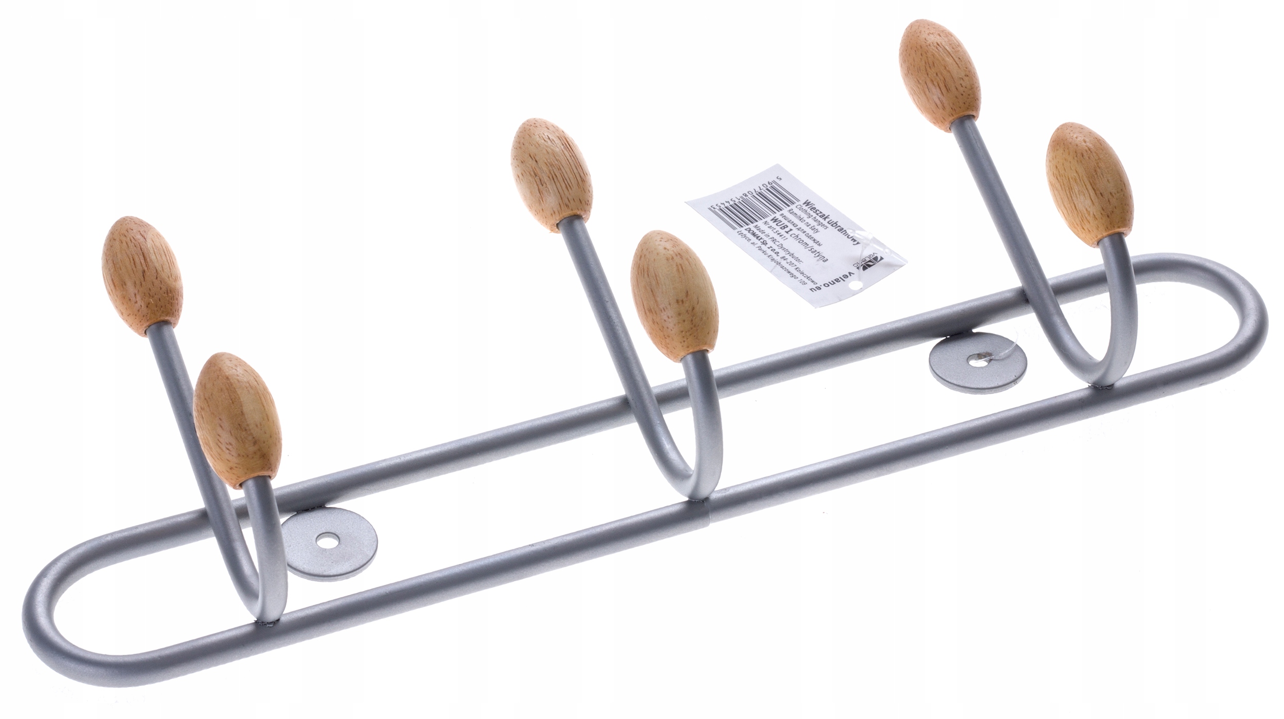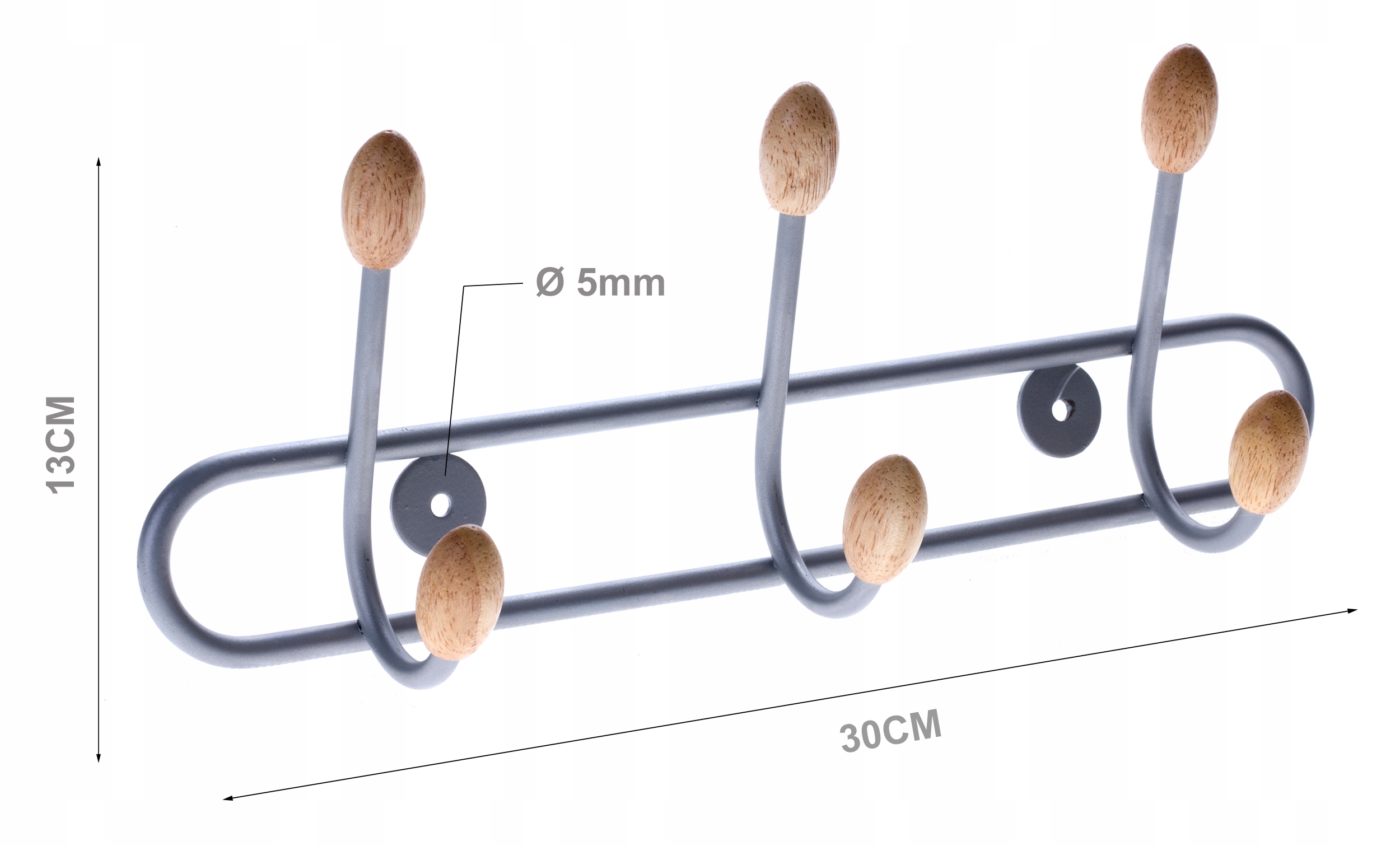 Metalowe wieszaki zakończone elementem z jasnego drewna dopełnią wystrój poczekalni, biura czy przedpokoju w domu.
