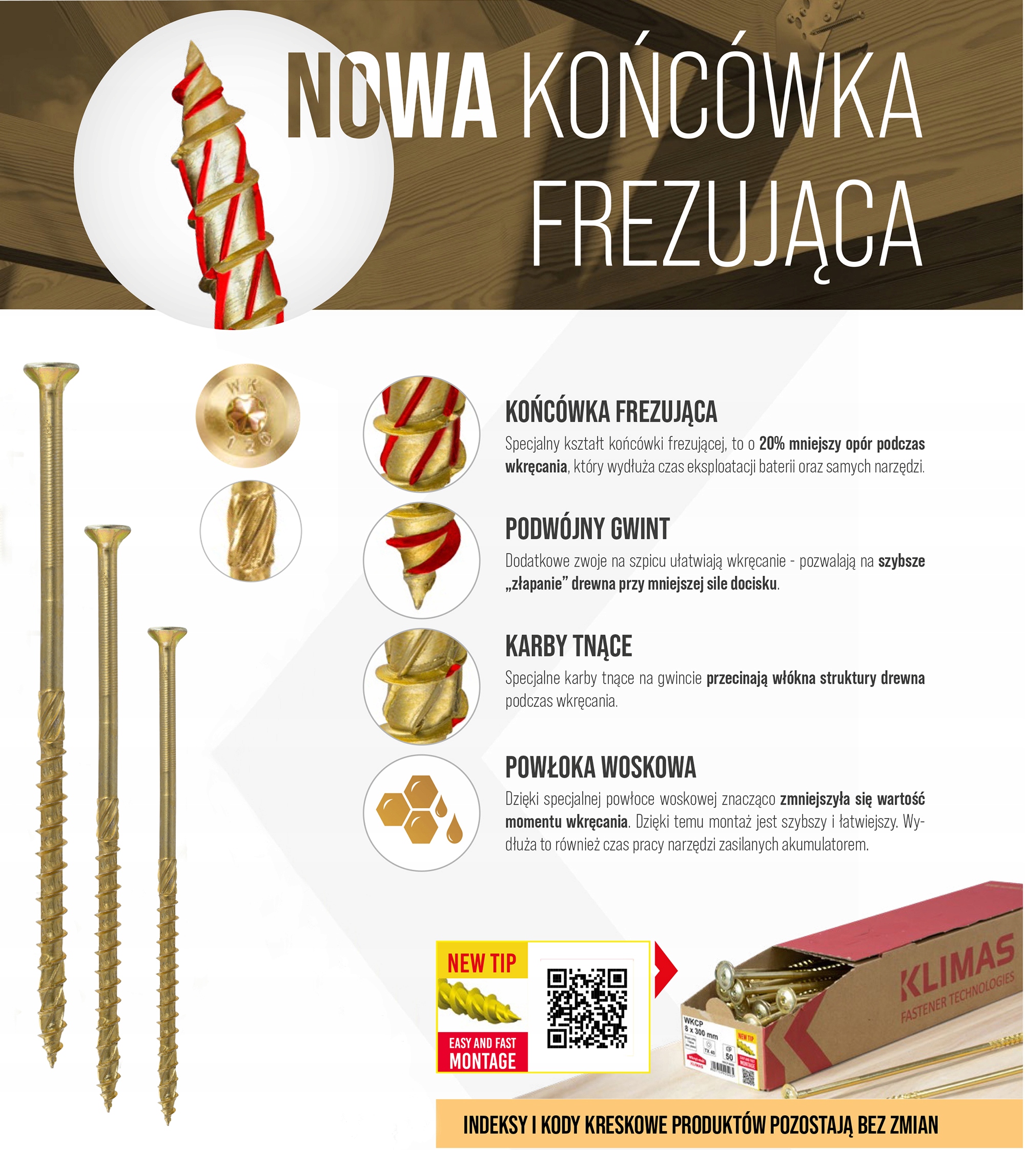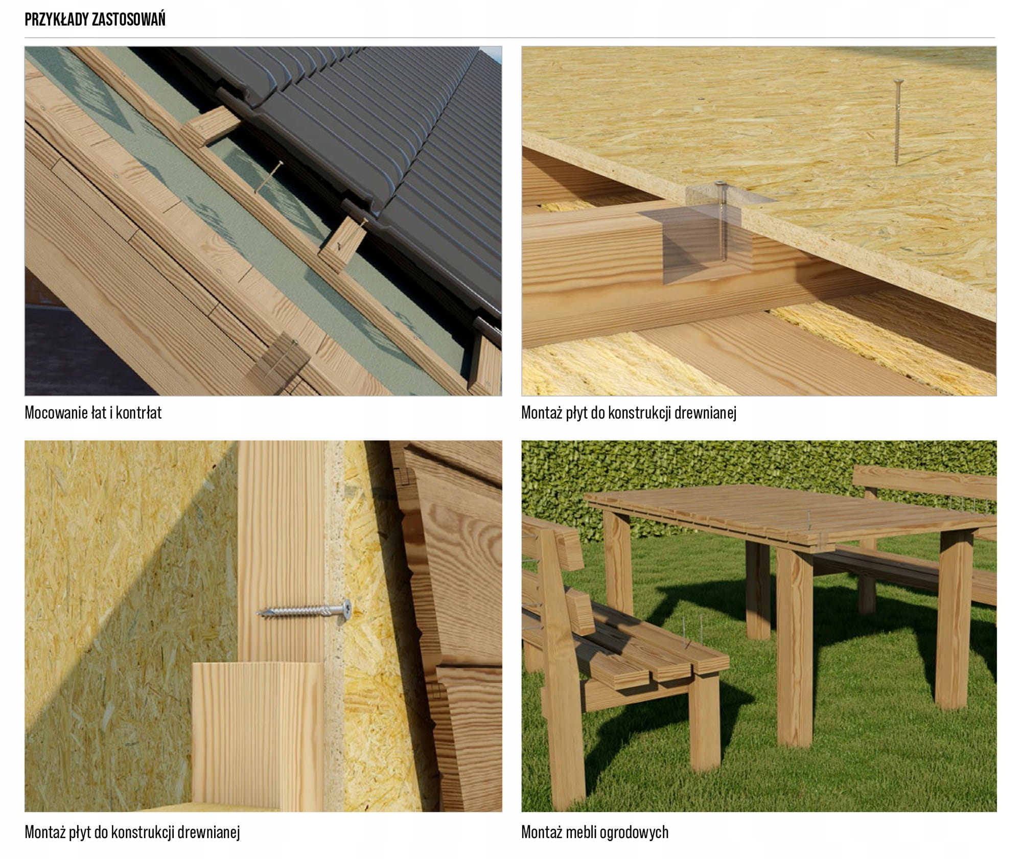 Wkręty konstrukcyjne znacząco poprawiają pracę przy montażu konstrukcji drewnianych, ponieważ posiadają polepszone zdolności do wkręcania się. Wkręty te w pełni zastępują gwoździe budowlane i nie wymagają nawiercania. Głębokie gniazdo TORX pozwala na lepsze przeniesienie siły wkręcającej i zapobiega wyskakiwaniu bitu.