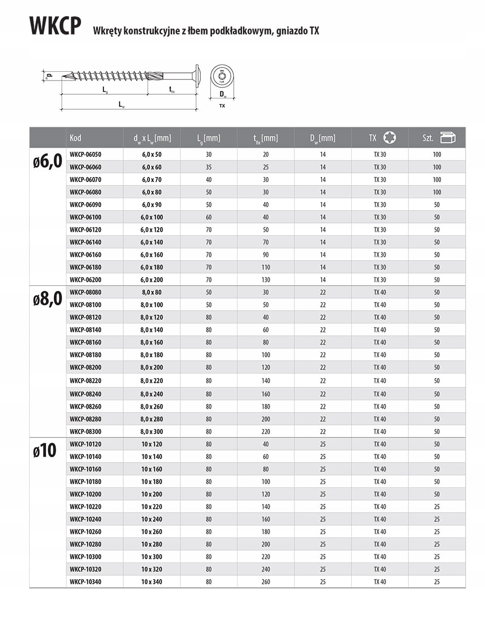 WKRĘTY CIESIELSKIE 8x180 TORX40 ŁEB TALERZOWY 50szt DO ŁĄCZENIA DREWNA