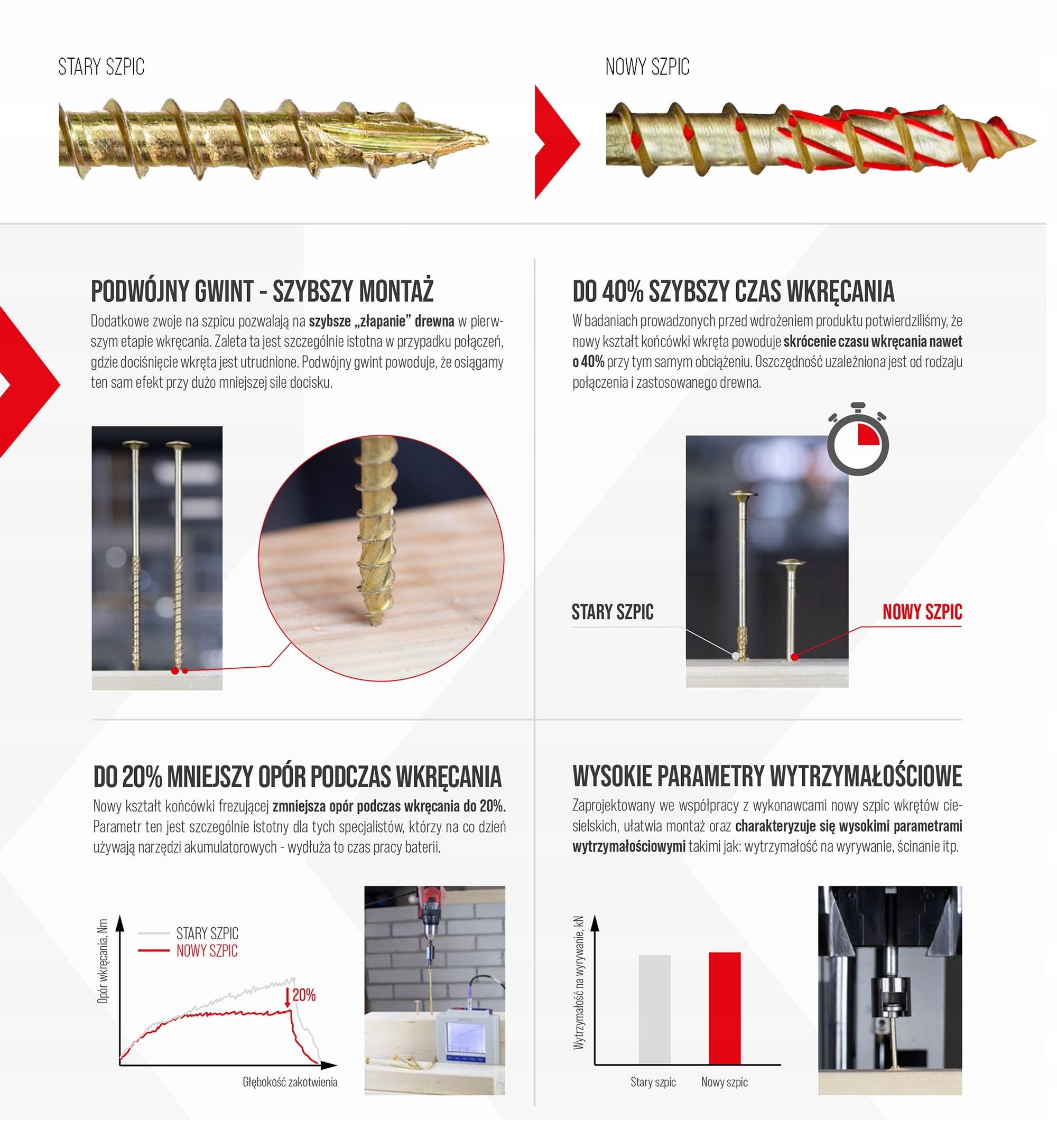 Wkręty konstrukcyjne znacząco poprawiają pracę przy montażu konstrukcji drewnianych, ponieważ posiadają polepszone zdolności do wkręcania się. Wkręty te w pełni zastępują gwoździe budowlane i nie wymagają nawiercania. Głębokie gniazdo TORX pozwala na lepsze przeniesienie siły wkręcającej i zapobiega wyskakiwaniu bitu.