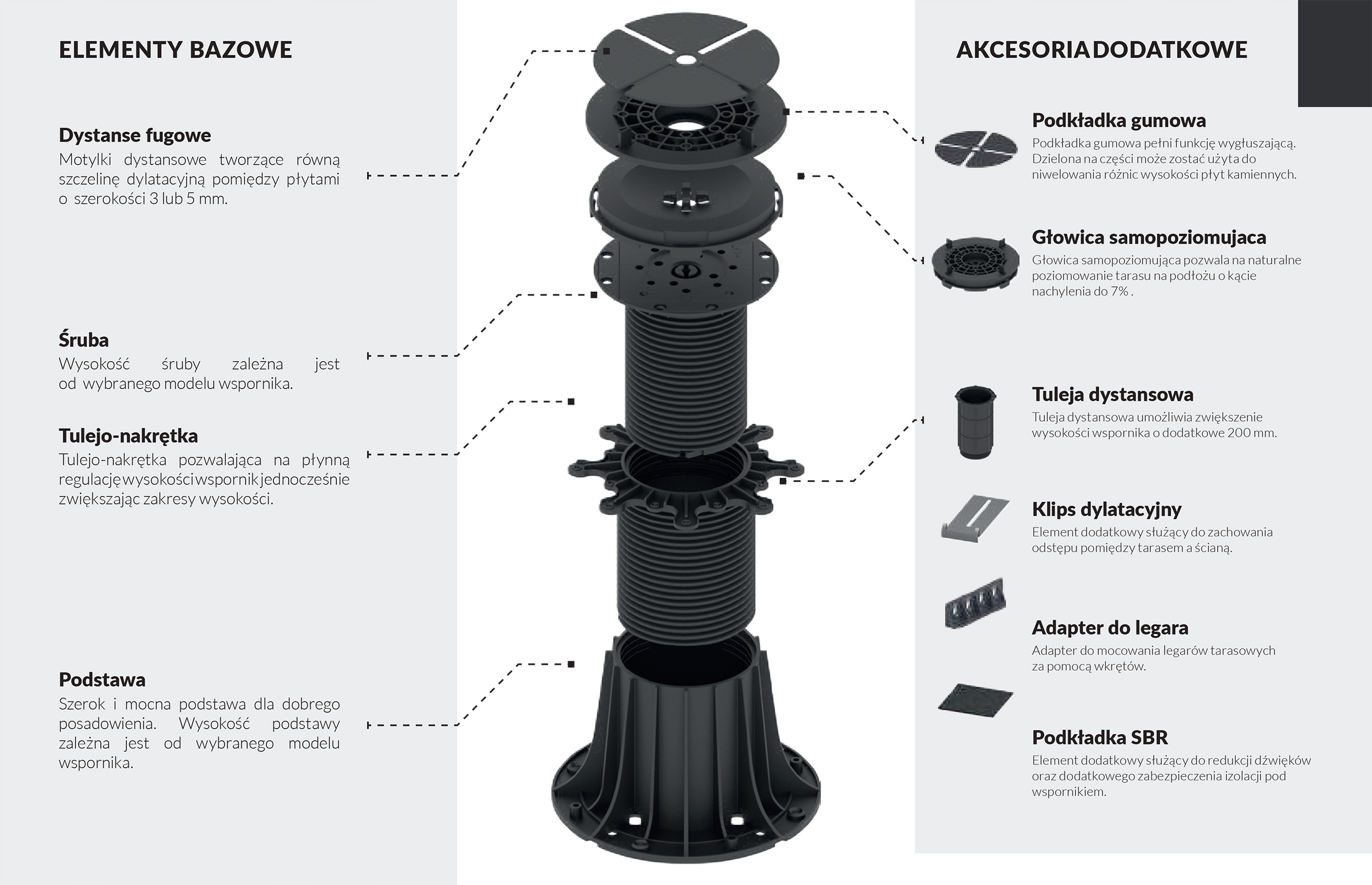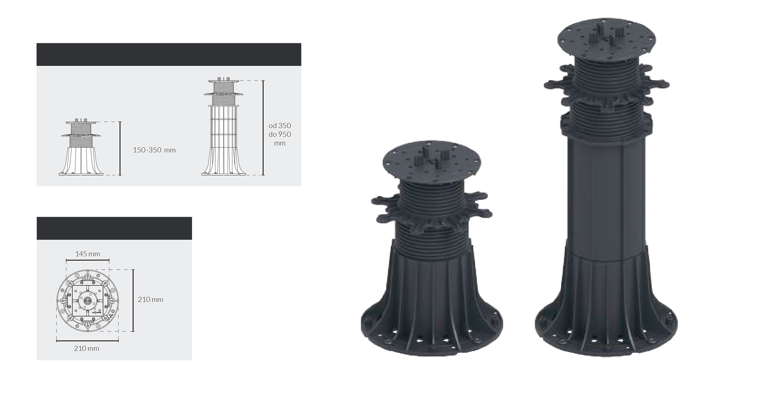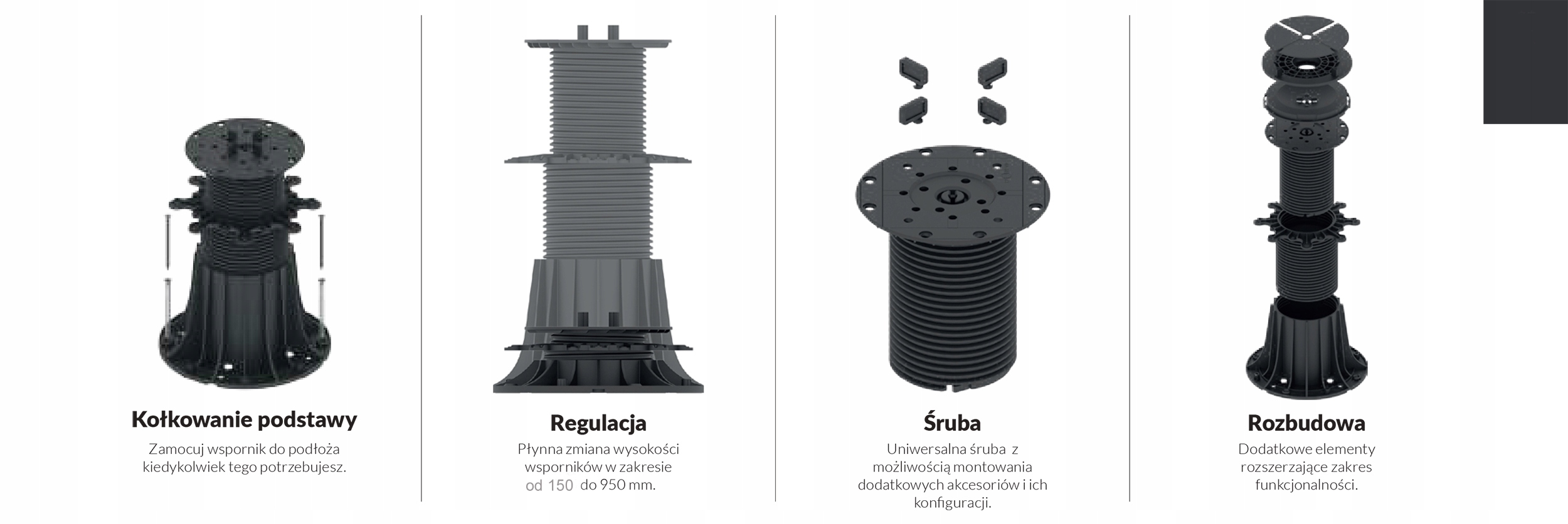 Wsporniki tarasowe z regulacją wysokości w zakresie 35 do 950 mm.