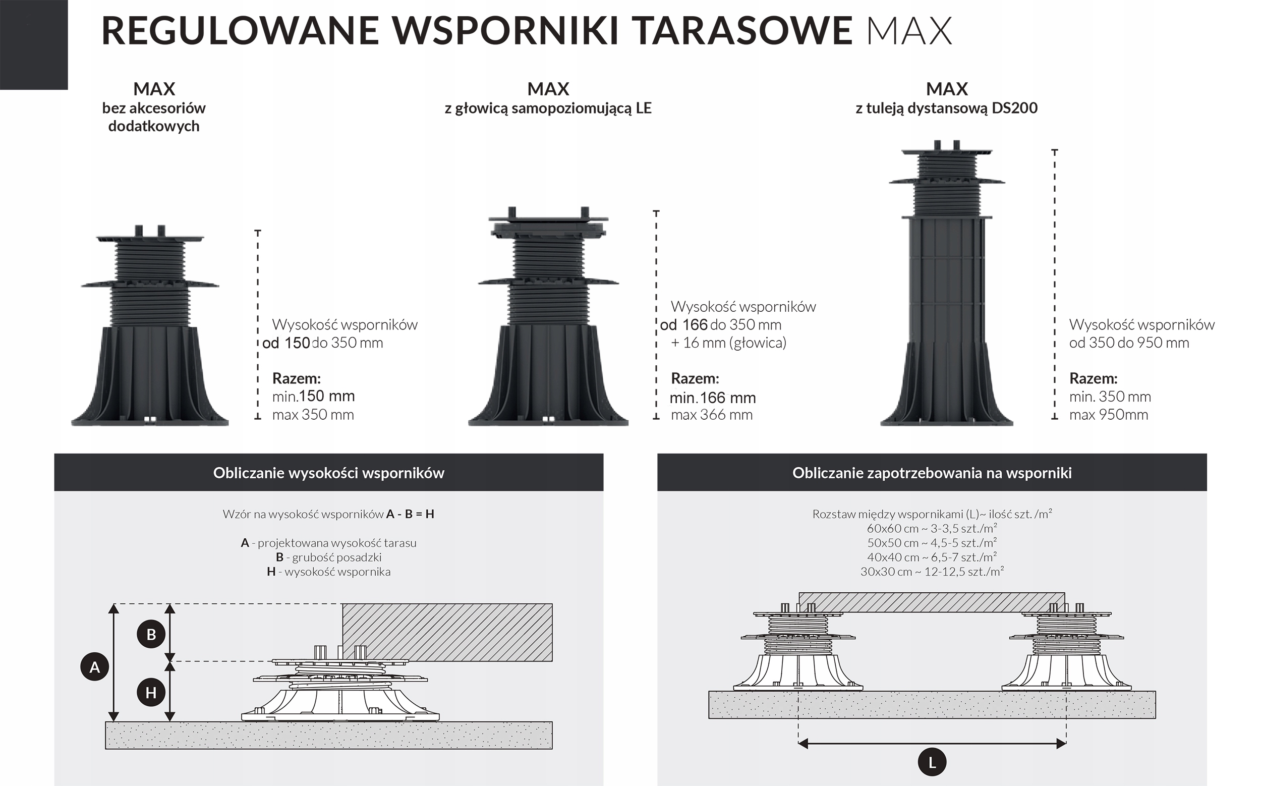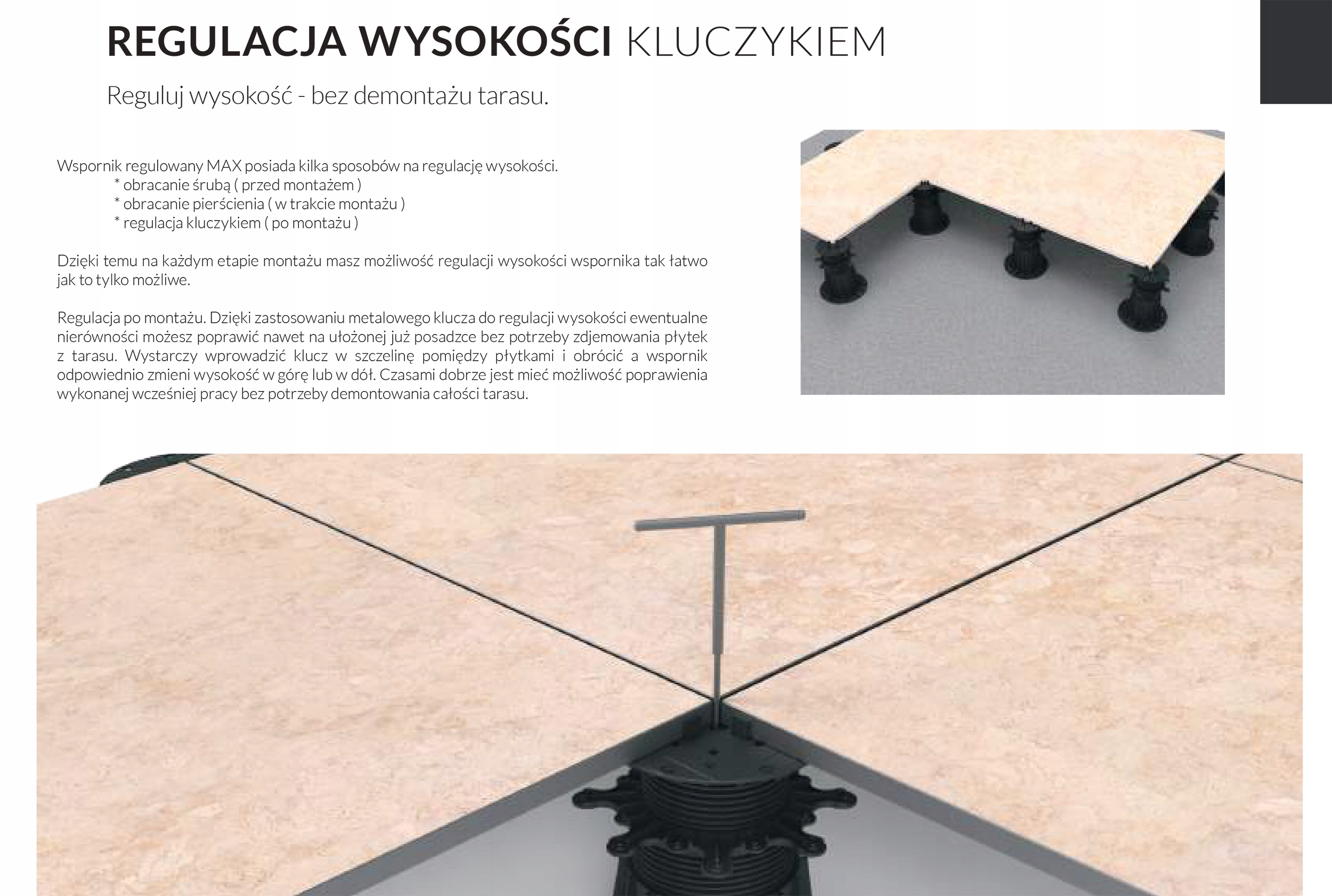 Wsporniki serii MAX mogą być zastosowane jako podparcie wszelkiego rodzaju płyt (np.kamiennych lub rektyfikowanych) z możliwością podparcia punktowego oraz konstrukcji z legarów pod tarasy WPC i drewniane.