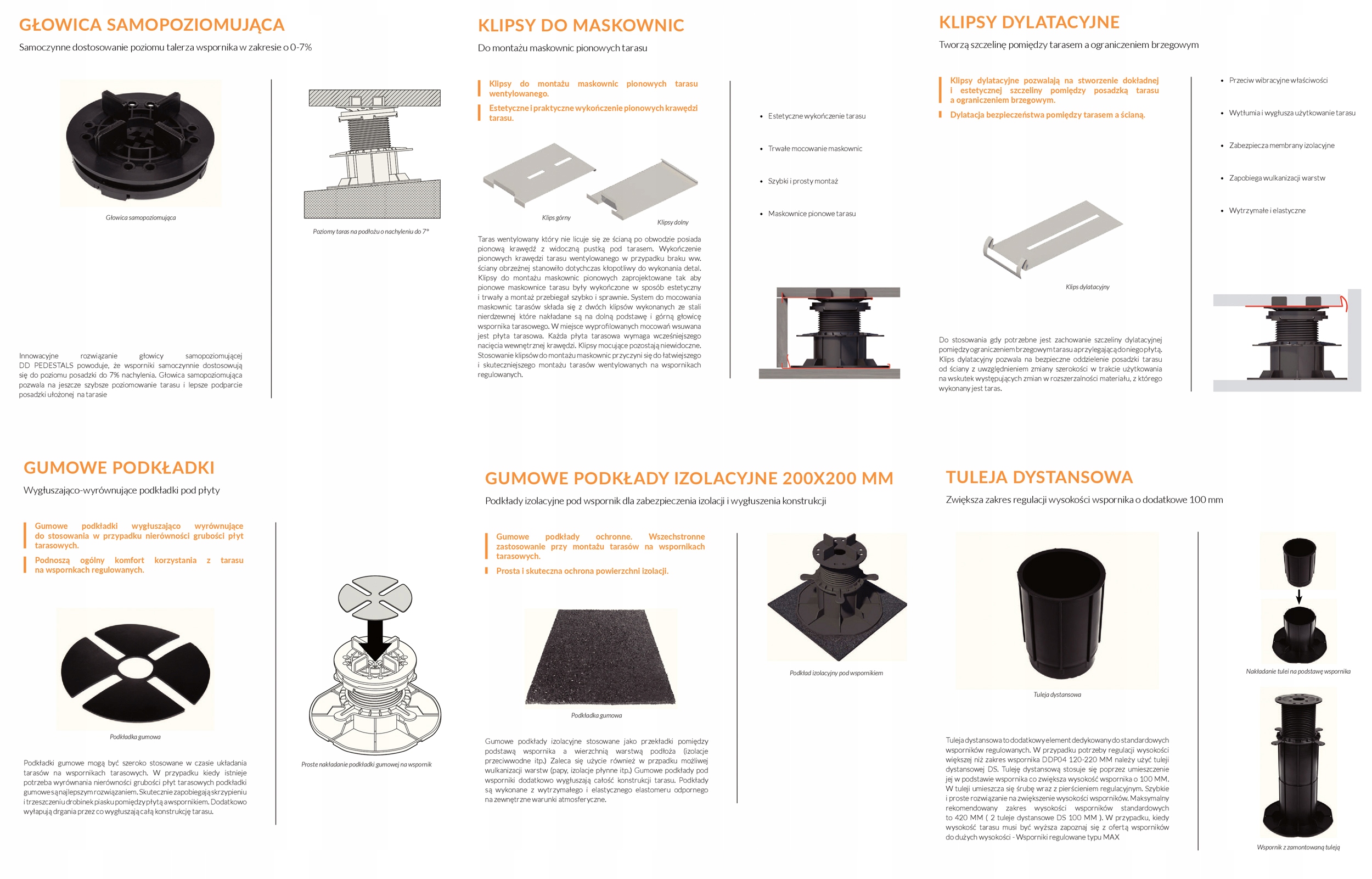 Wsporniki tarasowe są stosowane do podtrzymywania płyt tarasowych (drewnianych bądź kamiennych) w tarasach przeznaczonych do ruchu pieszego.