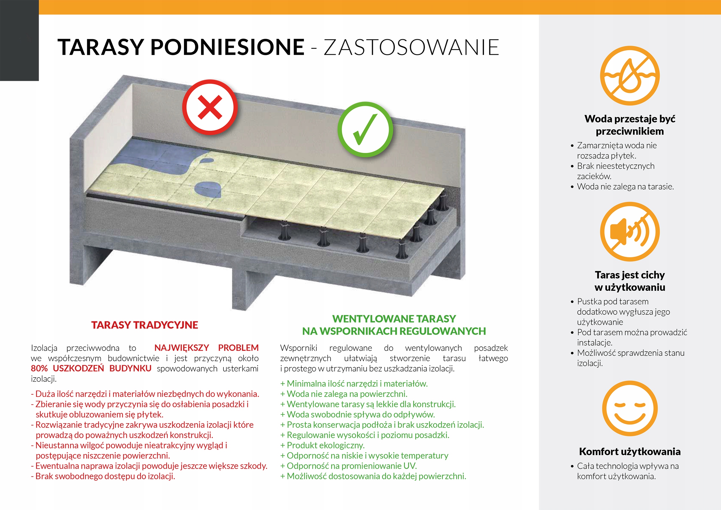 - Stabilna podstawa to solidny fundament tarasu, który wytrzyma obciążenia sięgające nawet 1000 kilogramów na jeden wspornik.