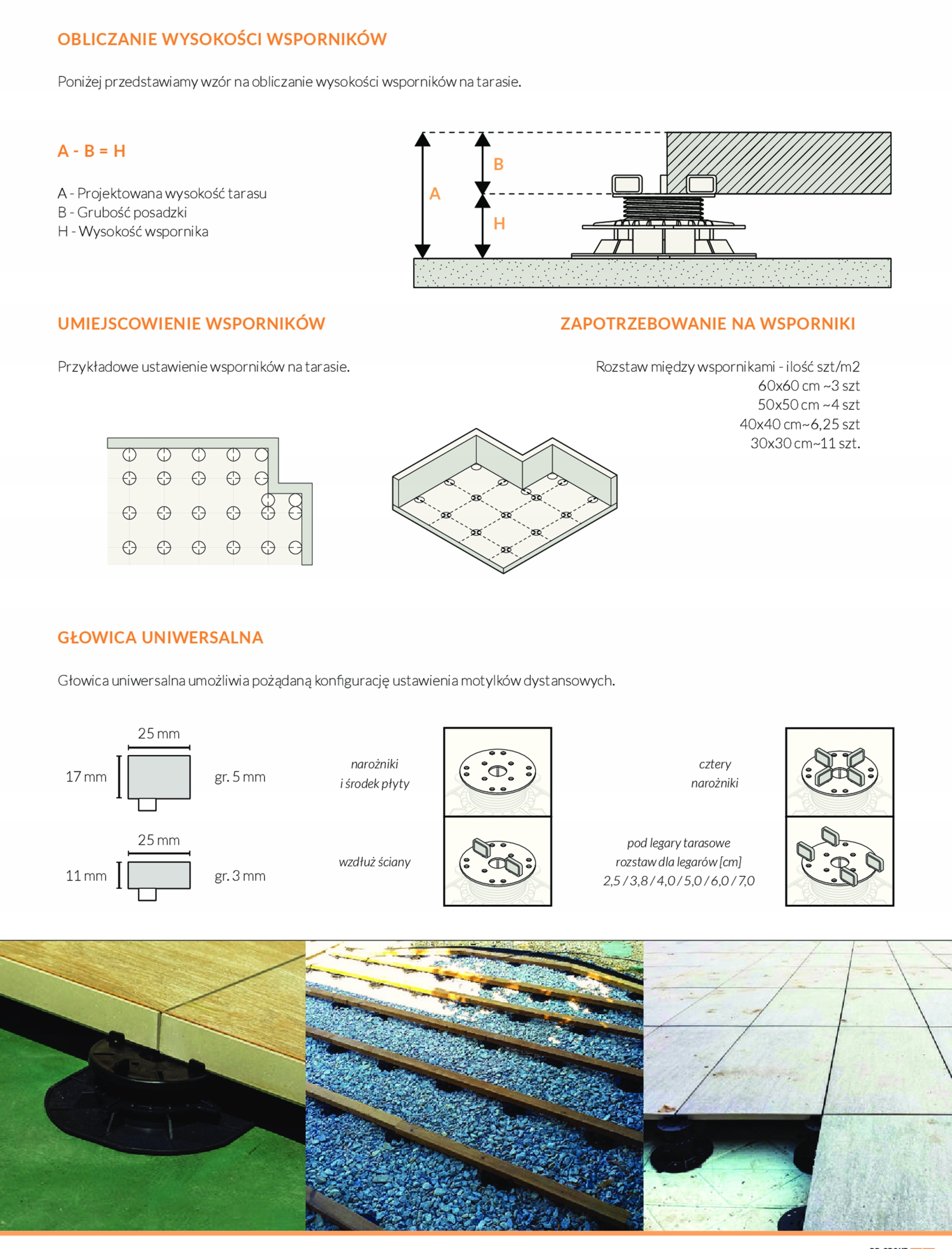 Wsporniki tarasowe są stosowane do podtrzymywania płyt tarasowych (drewnianych bądź kamiennych) w tarasach przeznaczonych do ruchu pieszego.